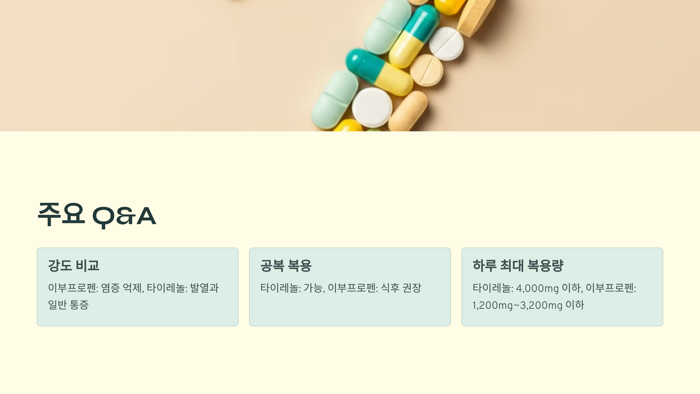 이부프로펜과 타이레놀은 서로 다른 메커니즘으로 작용하기 때문에, 의사의 지시가 있다면 병용할 수 있습니다. 하지만 약물 과다 복용을 방지하기 위해 권장 용량을 지켜야 합니다. 특히 간 독성과 위장 장애를 피하려면 전문의와 상의하세요.